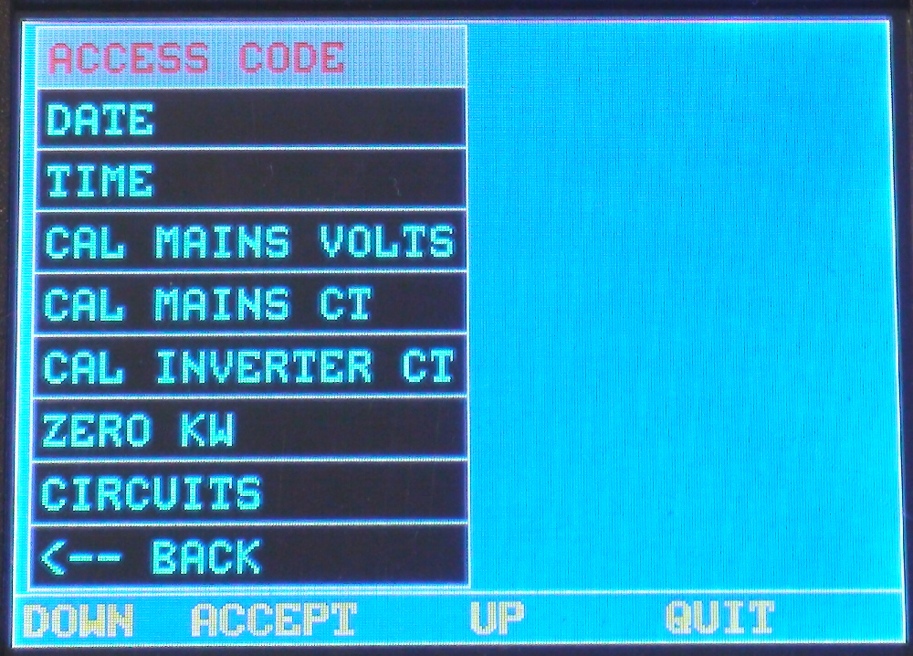 Here is where you can also set/change the Date and Time, zero Today's KW and access the CIRCUITS page where you define the rules of when to turn circuits ON or OFF.